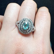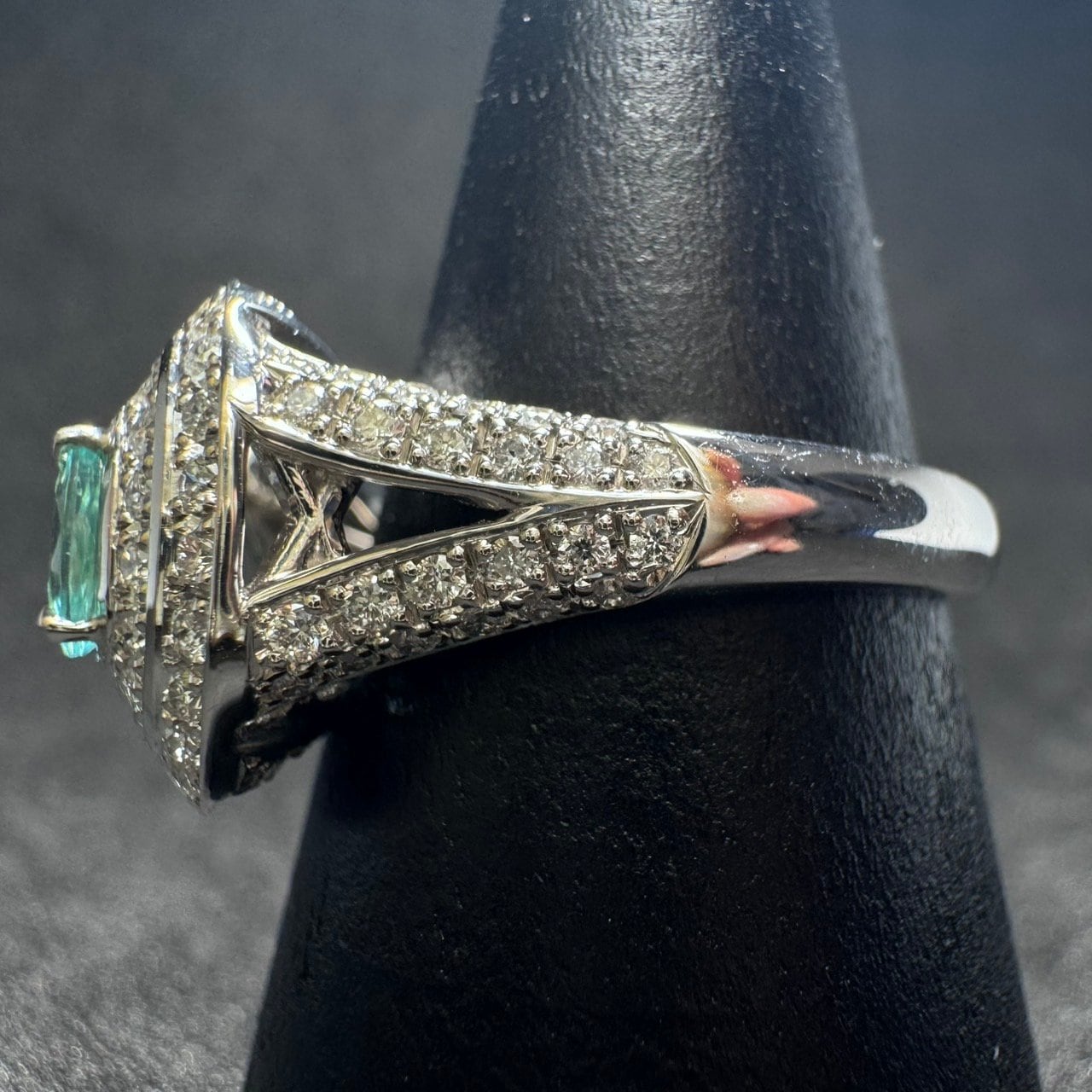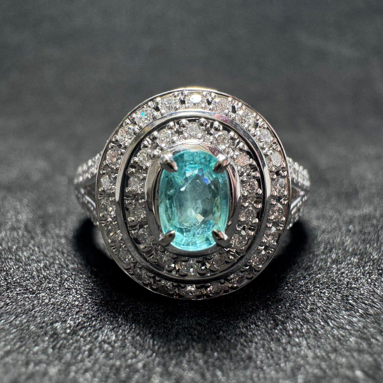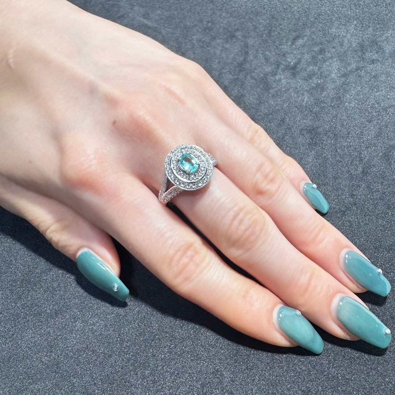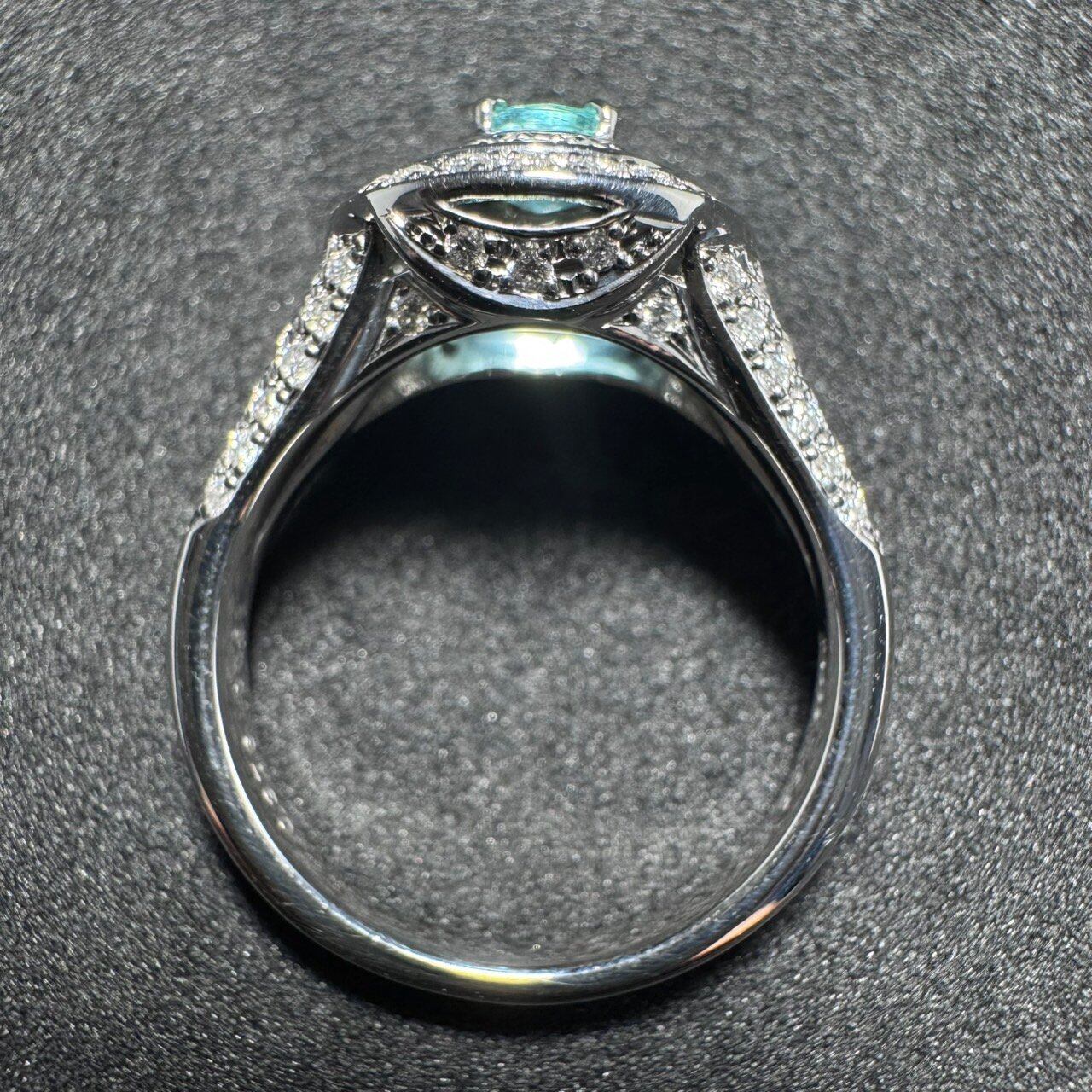 ・その美しき主役を引き立てるのは、トータル0.58ctの天然ダイヤモンドによる贅沢なダブル取り巻き。繊細なラウンドブリリアントカットのダイヤが、パライバのネオンブルーと絶妙なコントラストを生み出し、まばゆい光彩を指元に与えます。