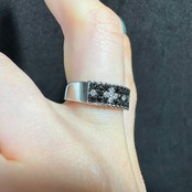・リング中央には、フラワーモチーフを彷彿とさせるホワイトダイヤが上品に輝き、まるで光の中心を象徴するかのように配置されています。その周囲を取り囲むブラックダイヤは、深い艶とミステリアスな魅力を放ち、全体のデザインを引き締めています。