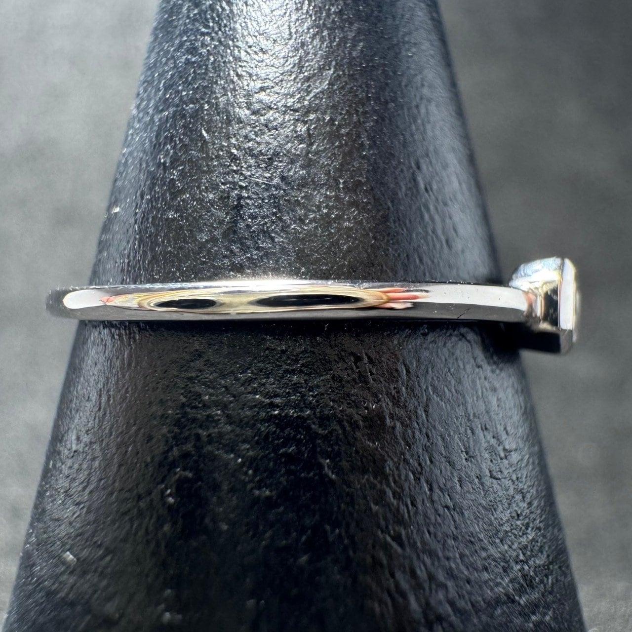 ・石座はすっきりと美しい覆輪留め。ダイヤモンドをしっかりと保護しつつ、モダンでクールな雰囲気をプラス。アームは極限まで細く華奢に設計されており、センターストーンの存在感をより一層引き立てます。華奢な手元にもよくなじみ、重ね付けにもおすすめの一本です。