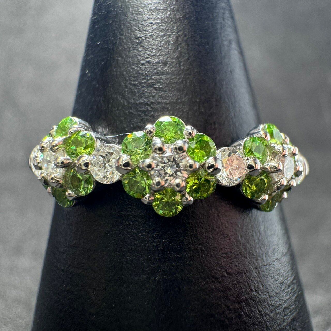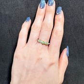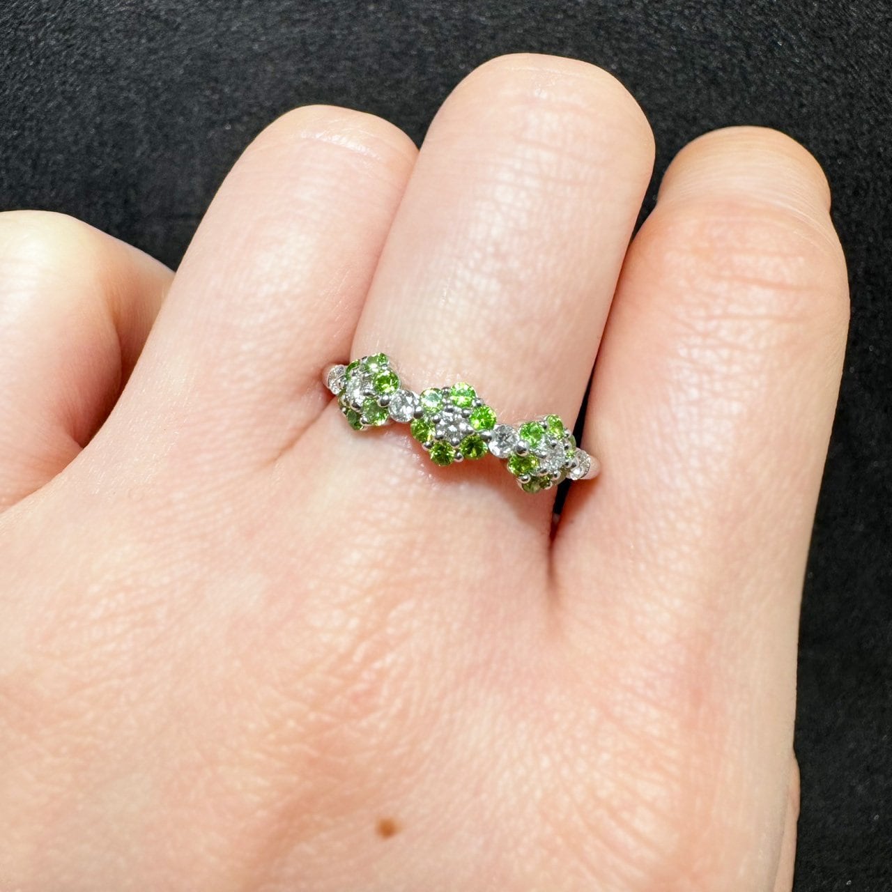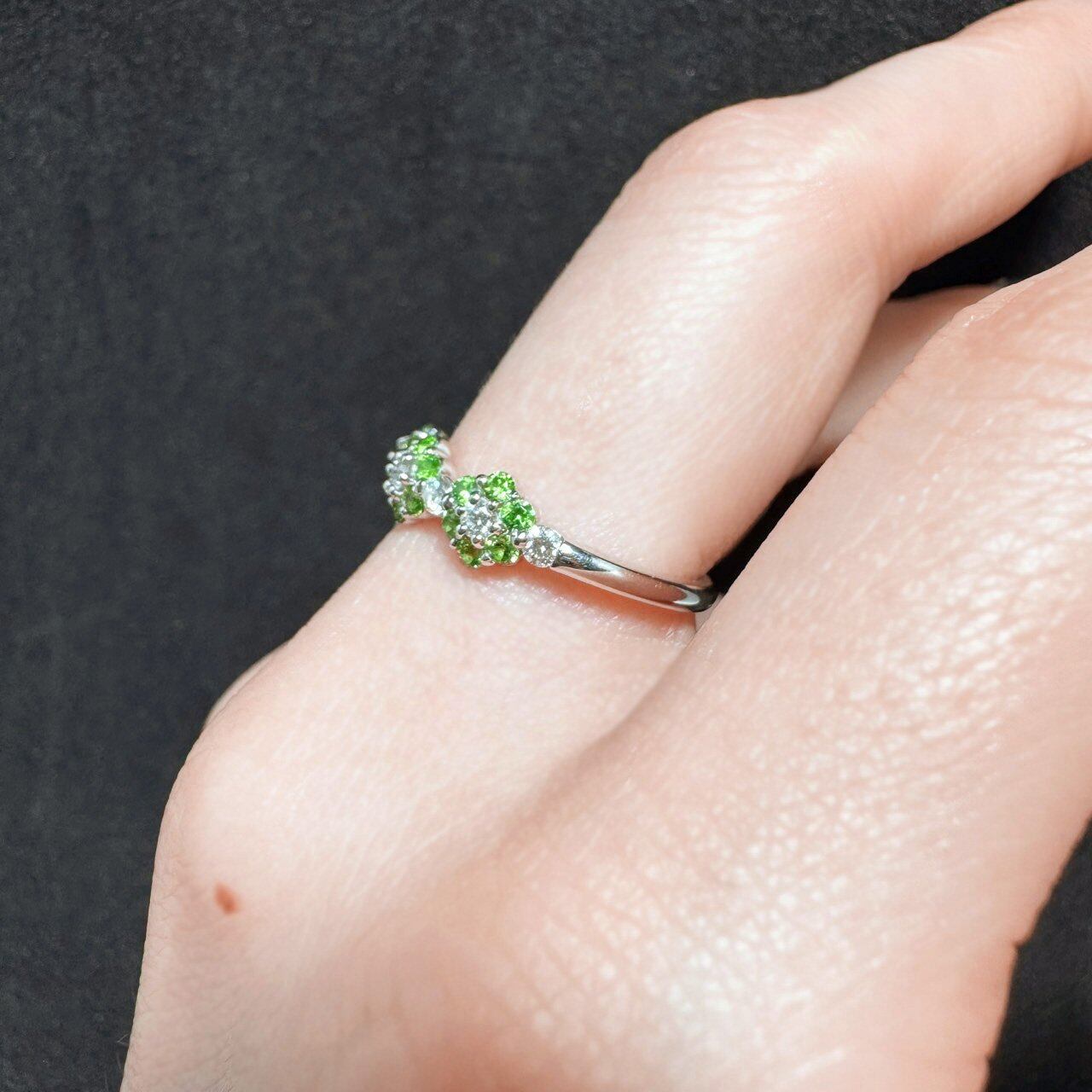 ひとつひとつのストーンがお花のように可憐にセッティングされており、リング全体で繊細なパターンを形成。瑞々しいグリーンとクリアなホワイトのコントラストが、まるで春の花園のような優雅な印象を指先にもたらします。幅約1.5mmと華奢なラインが、手元を繊細かつ上品に演出。しなやかなフォルムとリズミカルな配置が、どの角度から見ても美しい輝きを届けてくれます。