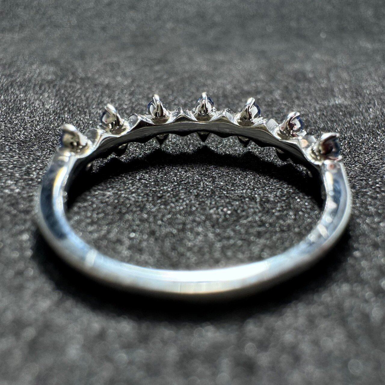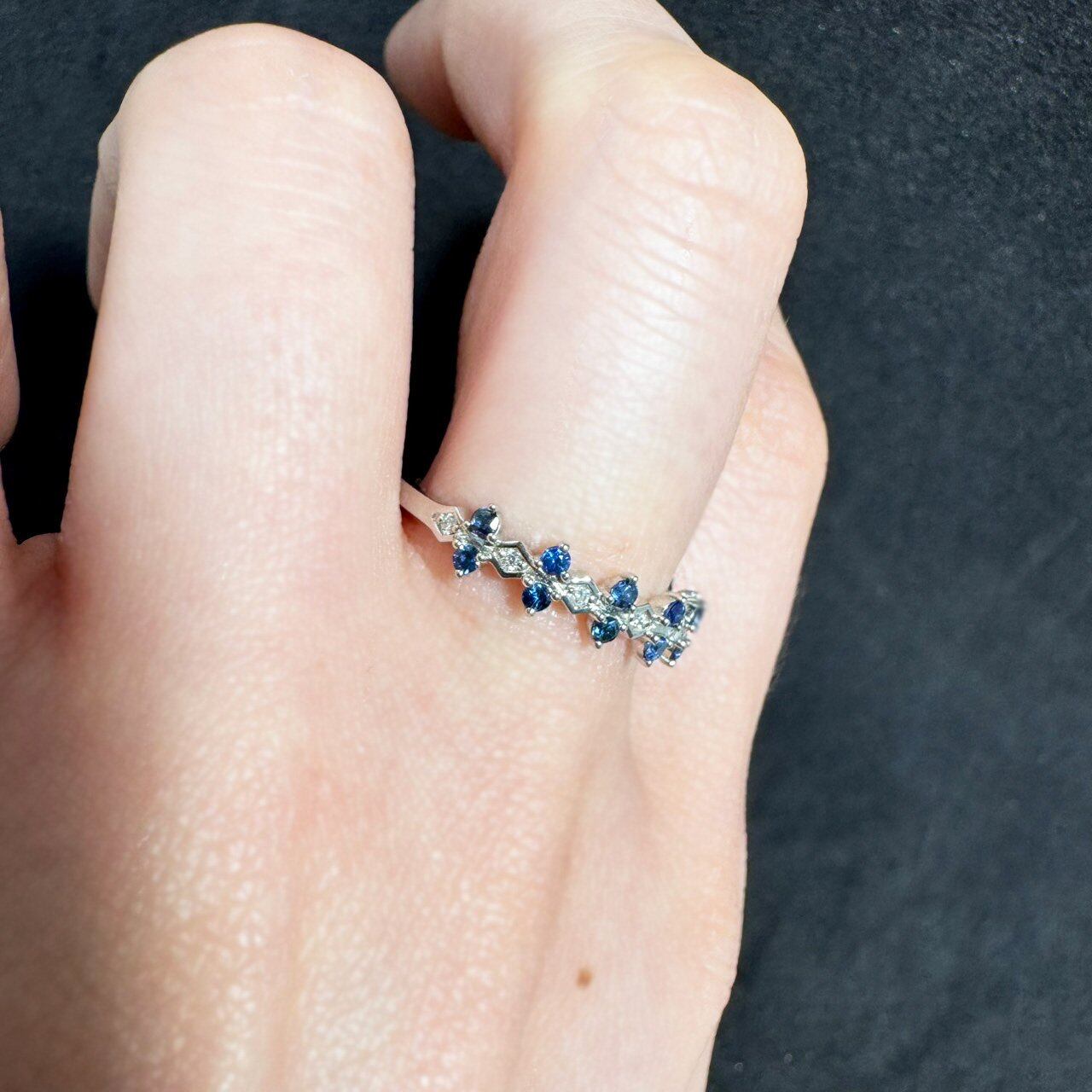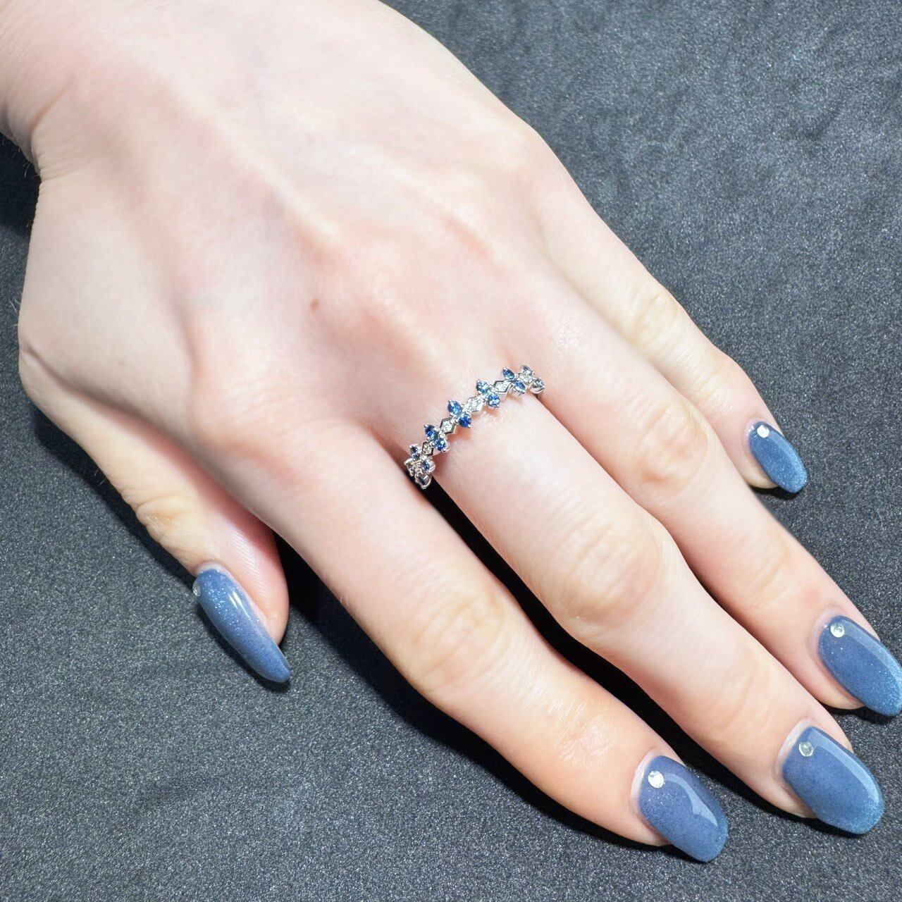 リング全体にあしらわれたラウンドカットのブルーサファイアが、見事な透明感と深みのある輝きで指先を彩ります。その間にきらりと輝くダイヤモンドが、サファイアの気品を一層引き立て、まさに洗練されたラグジュアリー感を演出。気品と華やかさを求める大人の女性にふさわしい、ワンランク上のリングです。