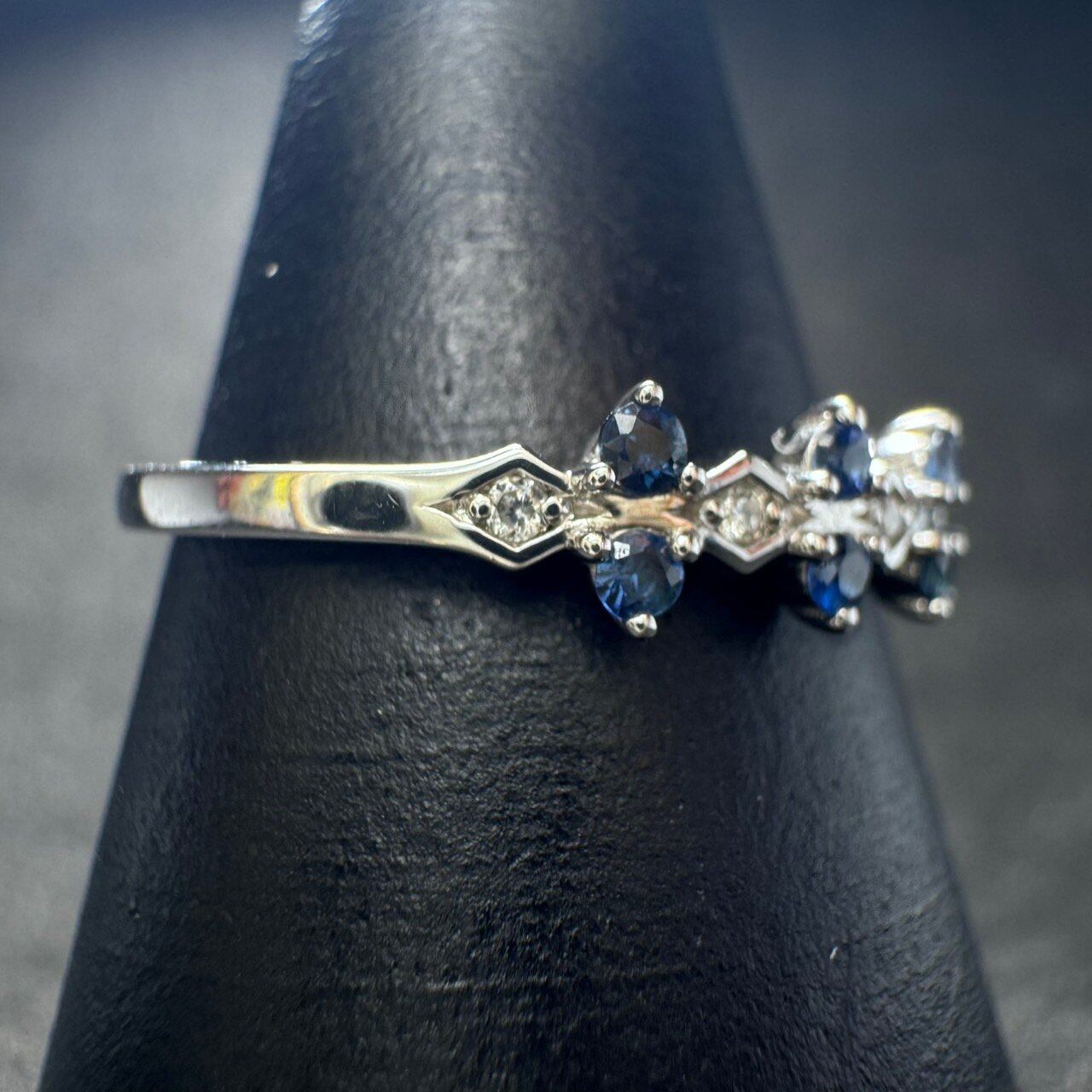 まるで夜空に浮かぶ星のような、幻想的なブルー。こちらは、繊細で華やかなデザインが目を惹くサファイアとダイヤモンドのリングです。