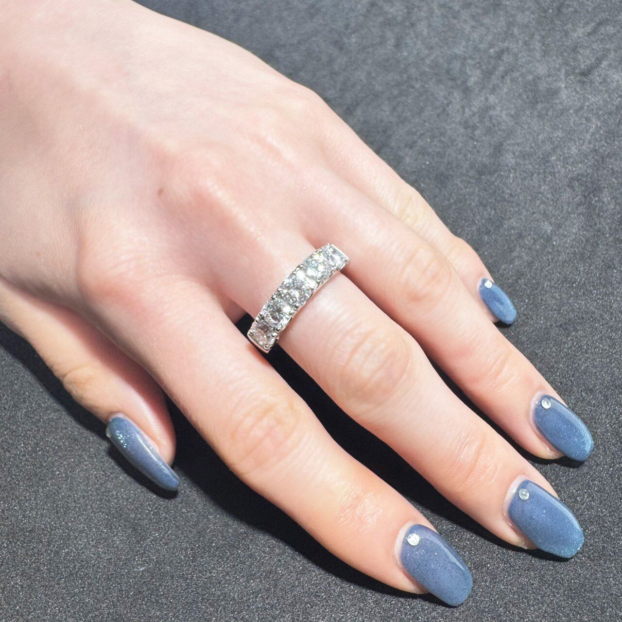 手元に圧倒的な存在感を。約0.4ctのラウンドブリリアントカットダイヤモンドを5pcセッティングした、まさにジュエリー上級者のための極上のエタニティリングです。トータル2.105ctの眩い輝きが、見る人すべての視線を惹きつけます。