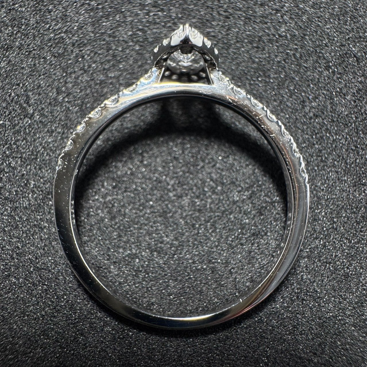 センターには、Dカラー・VS2クラス(0.216ct)の高品質なマーキスカットダイヤモンドをセレクト。縦長のフォルムが指をスラリと見せ、シャープな印象と女性らしい優雅さを演出してくれます。周囲には、0.22ct分の上質なメレダイヤモンドを繊細に取り巻き、中心のダイヤモンドをより大きく、より華やかに引き立てています。光が当たるたびに細やかな煌めきが広がり、手元に気品ある存在感を添えてくれます。