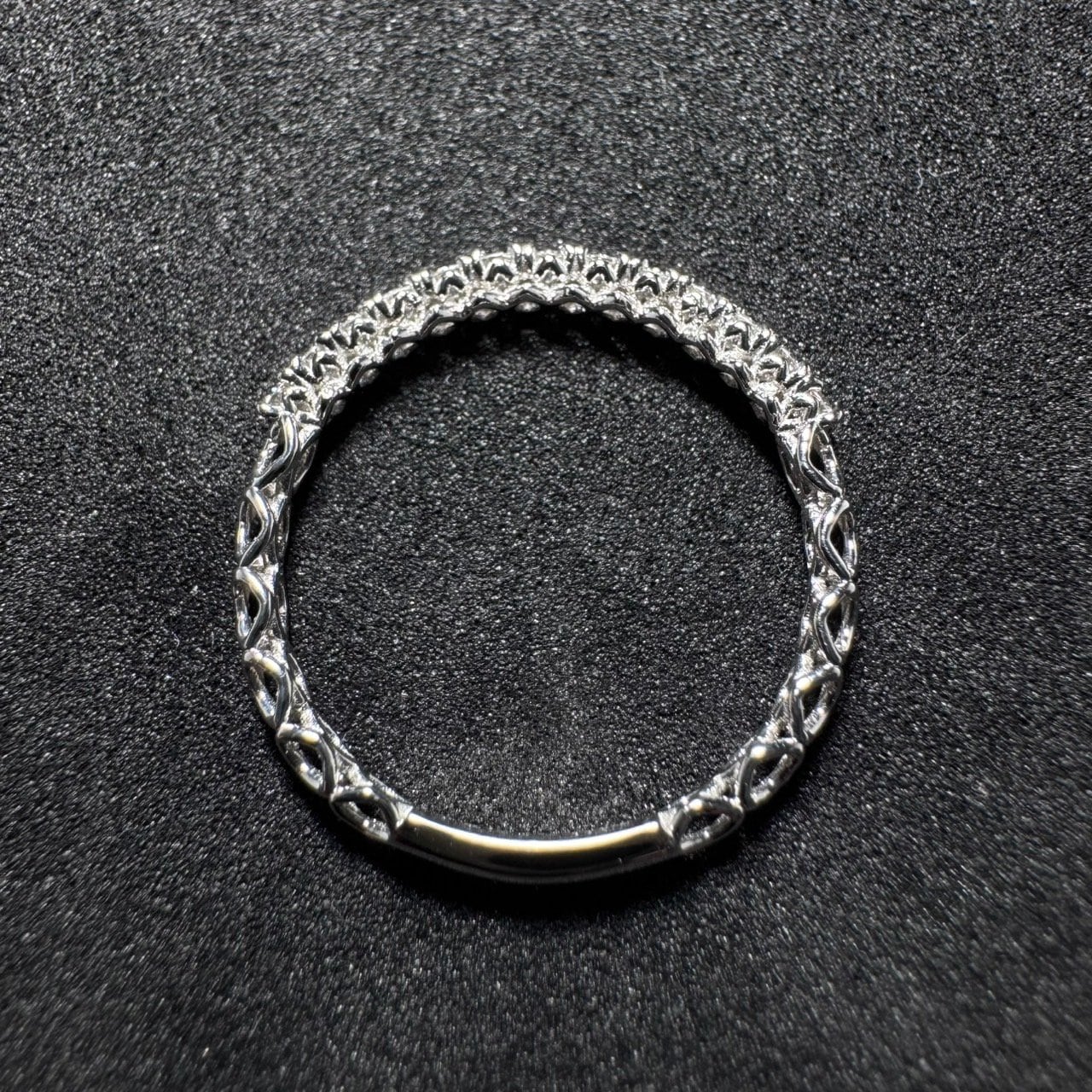 リングの腕部分には、エレガントな透かし模様が施され、細やかな細工が生み出す光と影のコントラストが、指元に繊細な美しさを添えます。小粒のダイヤモンドが連なることで、動くたびにきらめきが変化し、どの角度から見ても美しい輝きを放ちます。