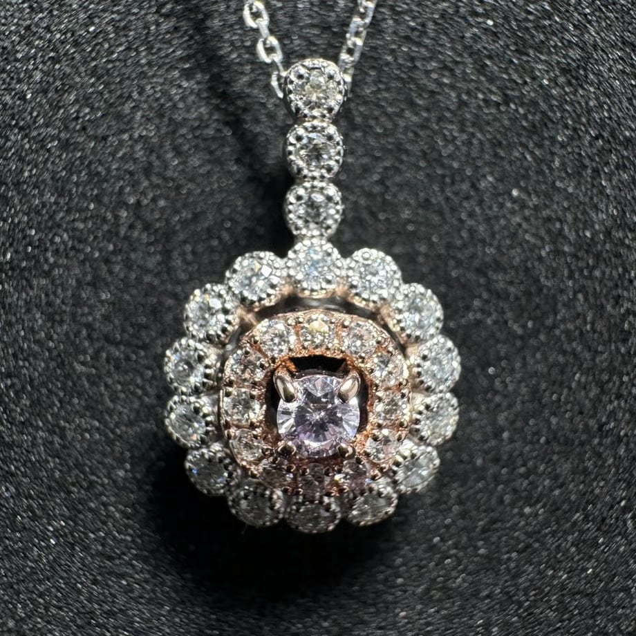 極めて希少な天然ピンクダイヤモンドをセンターにあしらった、特別なネックレス。ピンクダイヤモンドは、ダイヤモンドの中でもわずか0.01%しか産出されない希少な宝石であり、その美しい色合いと神秘的な輝きが魅力です。