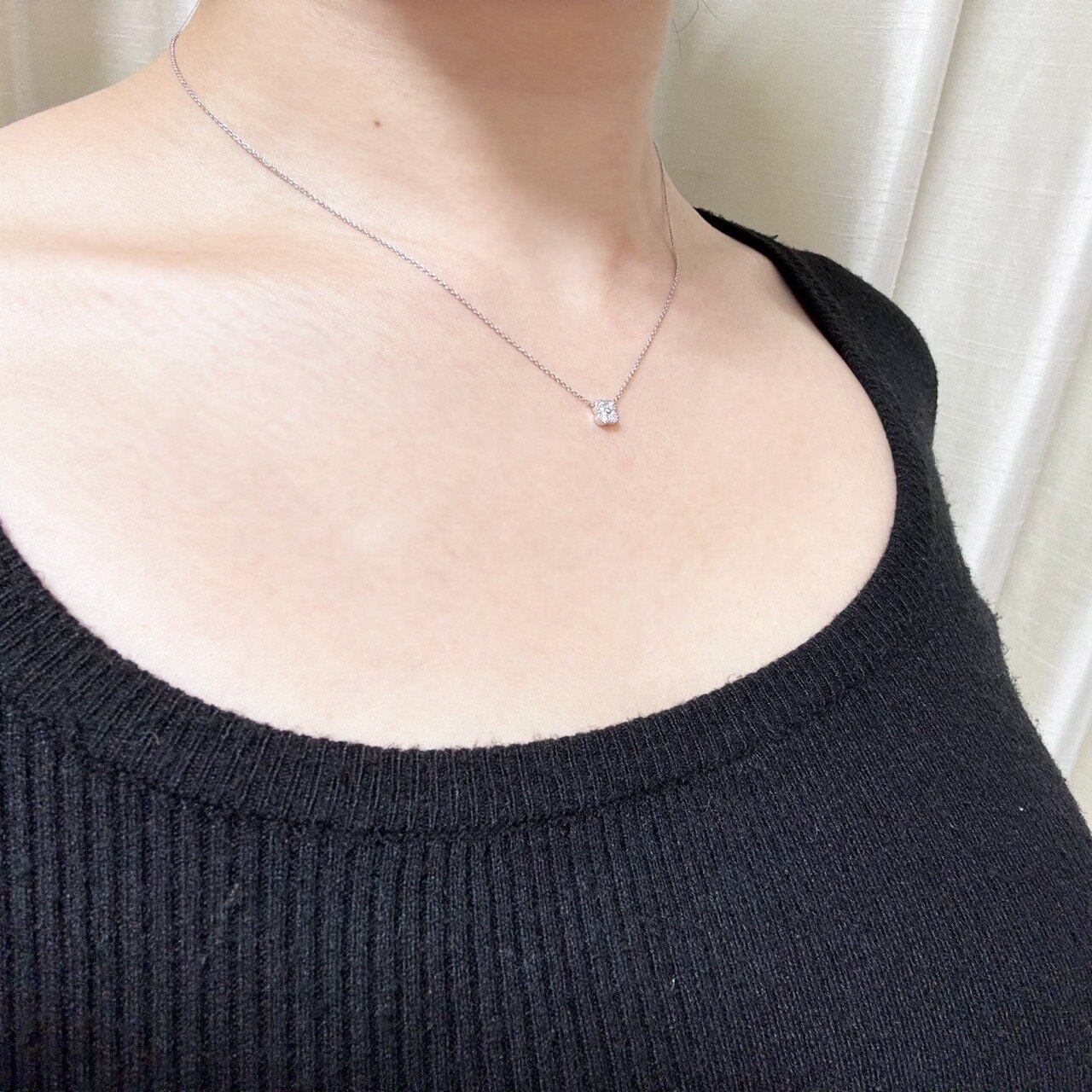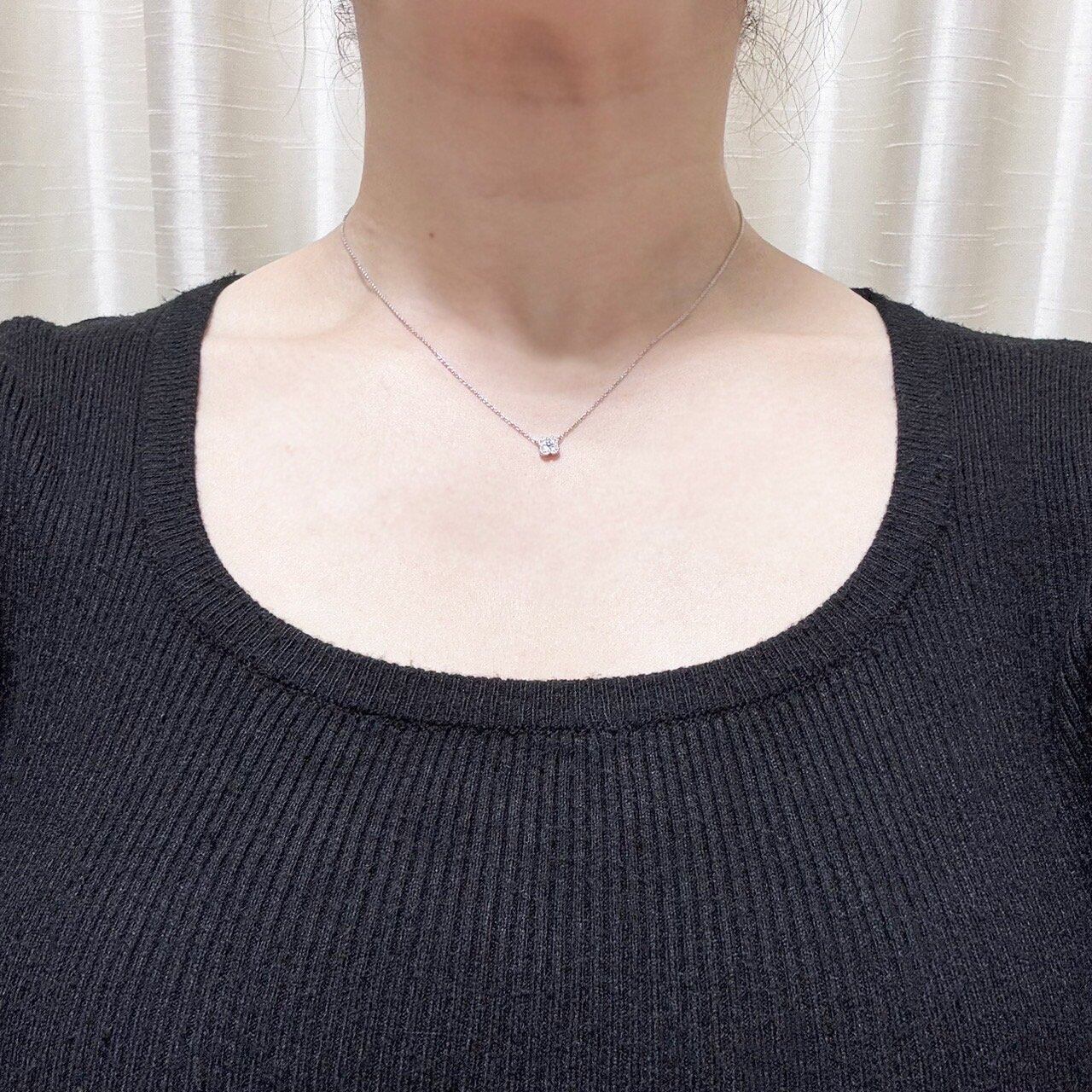 直径約5mmと小ぶりなサイズ感ながらも、ダイヤモンドの輝きがしっかりと存在感を放ちます。両吊りタイプのため、ペンダントトップがズレにくく、常に美しいバランスで着用できるのも嬉しいポイント。オン・オフ問わず、どんなスタイルにも合わせやすい万能デザインです。