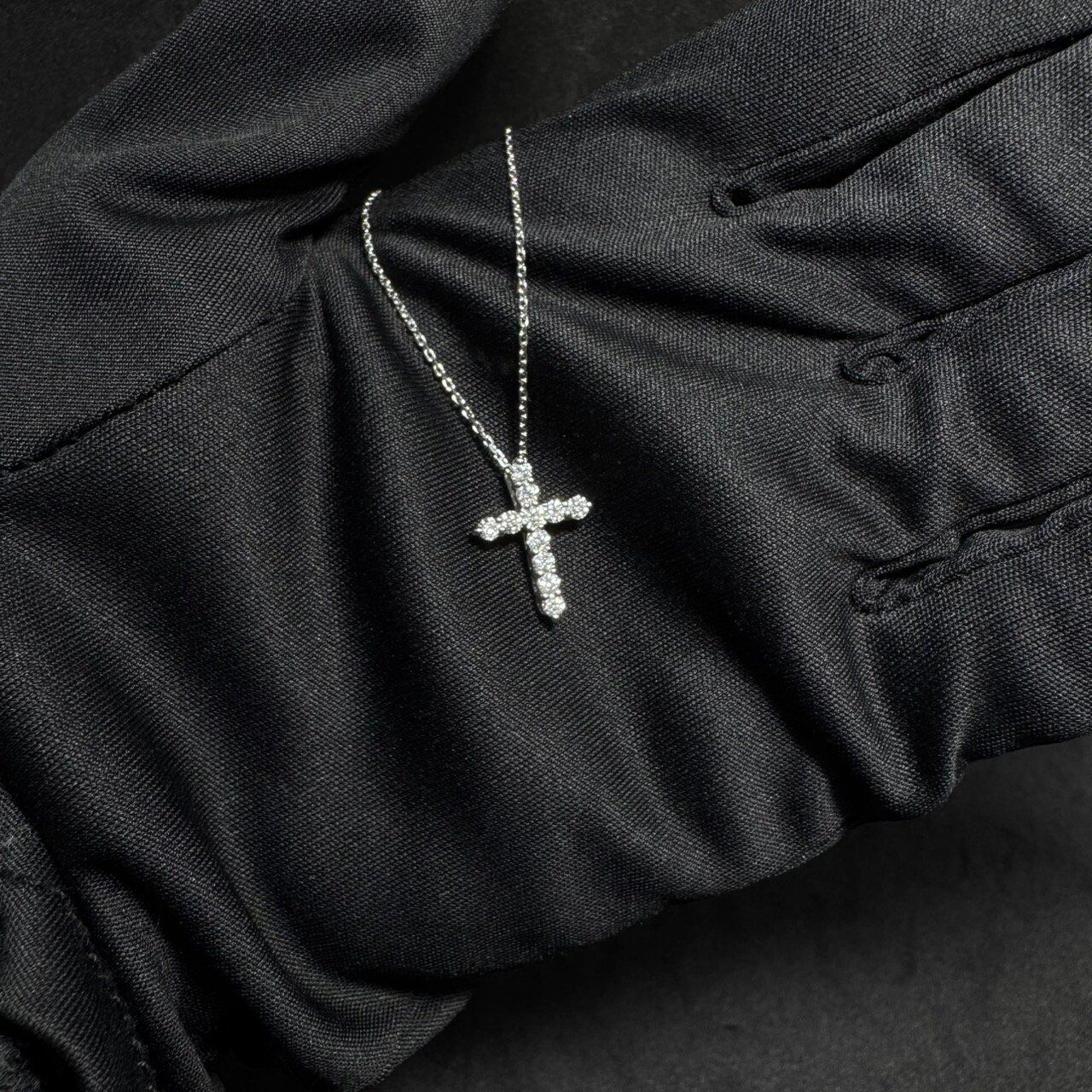 繊細に輝くダイヤモンドが11粒(トータル0.3ct)セッティングされたクロスデザインは、見る角度によって表情を変える繊細なきらめきを放ちます。1粒1粒厳選されたダイヤモンドは、当店が自信を持ってお届けする高品質な輝きが特徴です。クールな色味のプラチナがダイヤモンドの透明感を引き立たせます。