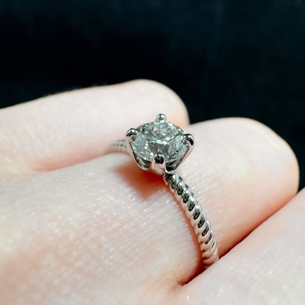 華奢なアームが大粒のセンターダイヤモンドを引き立てます。シンプルなソリティアタイプですが、ツイストしたデザインにこだわりも詰まっております。カラーは鉱物上、無色透明と言ってよいほどの色味ですので、黄色さもそれほど目立ちません。照りのよいダイヤモンドを厳選いたしましたので輝きも美しく、ご婚約指輪としても喜ばれるアイテムです。
