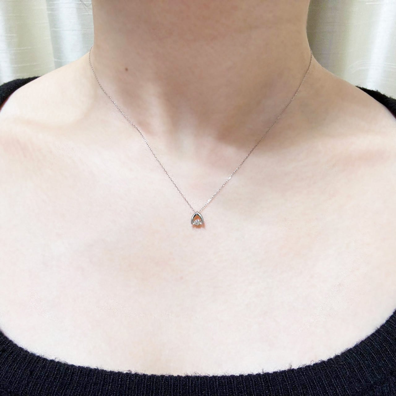 トップとチェーンには上質なPt900を使用。流れるようなフォルムがダイヤモンドの輝きを引き立て、甘さを抑えた大人の印象に仕上げています。シンプルだからこそ、年齢やスタイルを問わず長くご愛用いただけるデザインです。