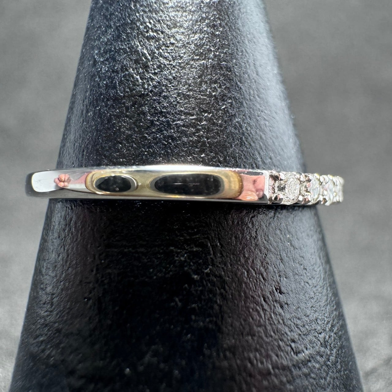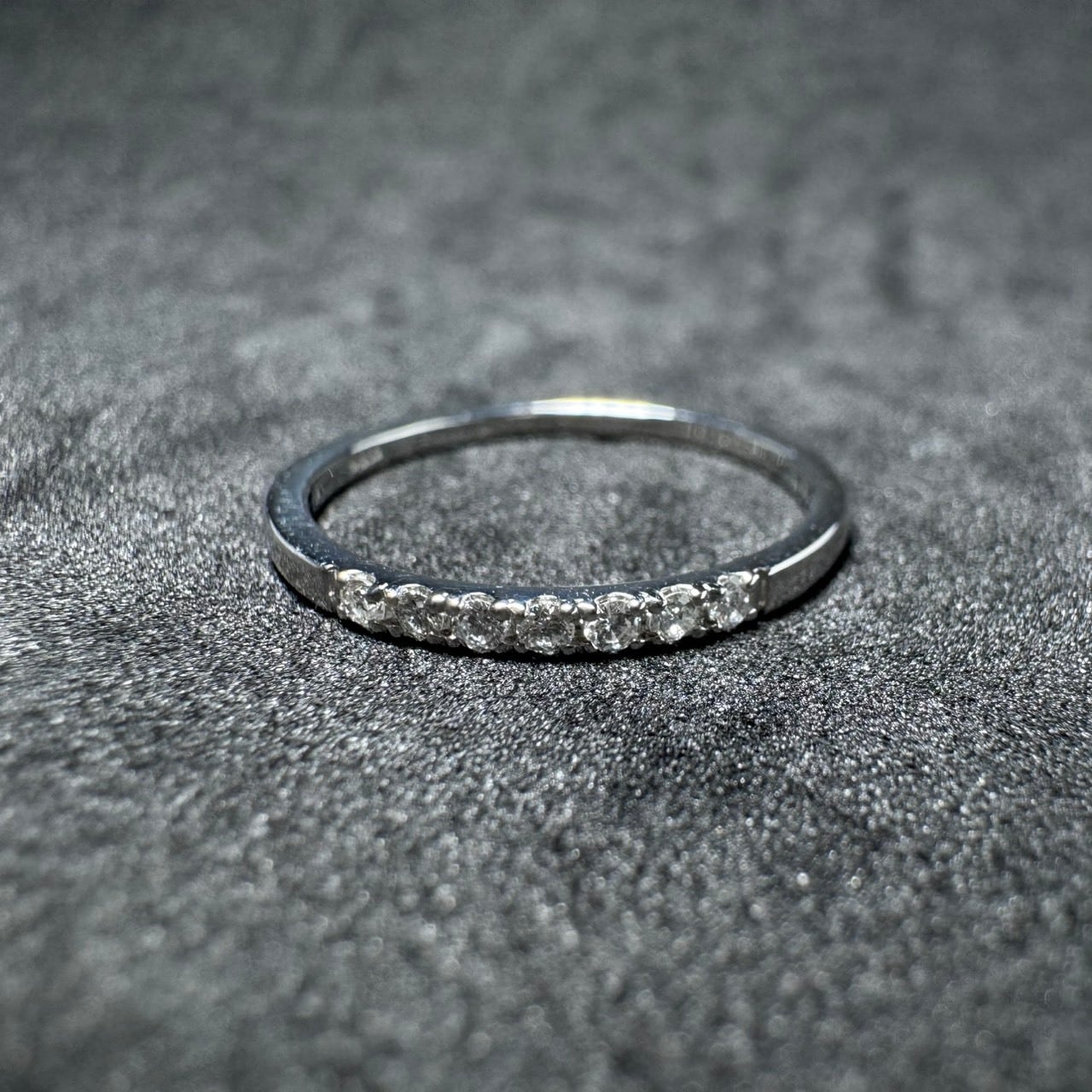 バランスよくセッティングされた7pcのダイヤモンドが、細身のリングに上品な存在感をプラス。トータル0.10ctならではの程よい輝きで、華美になりすぎず大人の手元にしっくりと馴染みます。