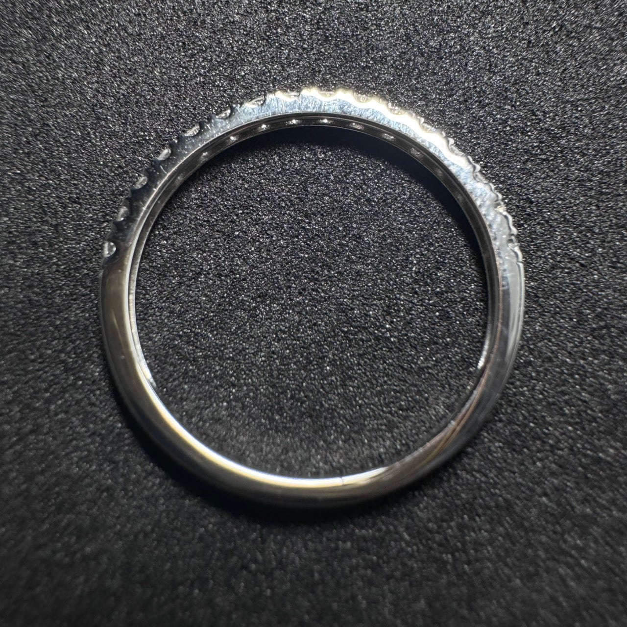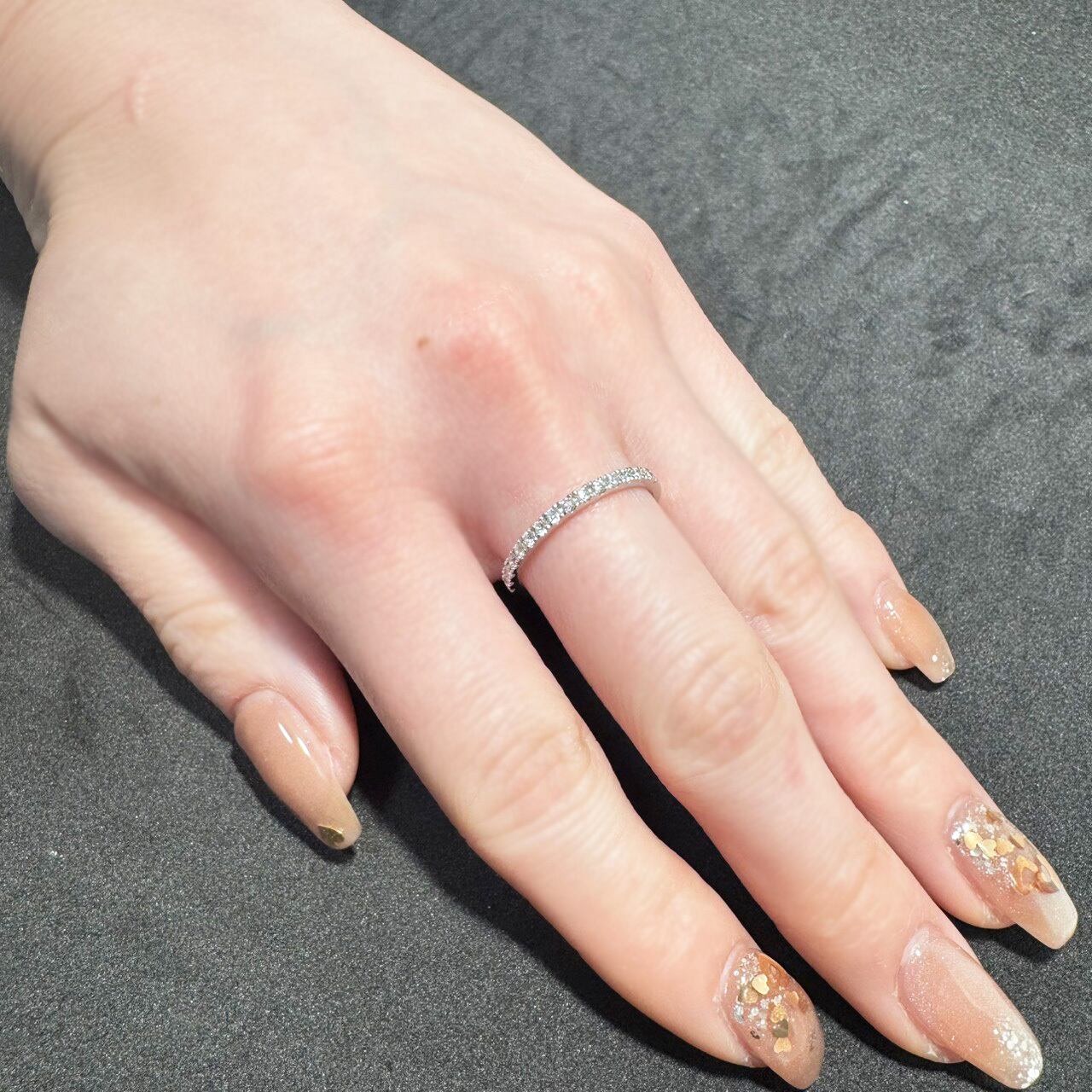 ダイヤモンドが半周までのデザインは、華やかさと着け心地の良さを両立。手のひら側はすっきりとしているため日常使いしやすく、リングが回っても過度に気になりにくいのも魅力です。
