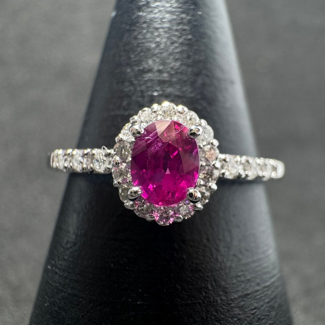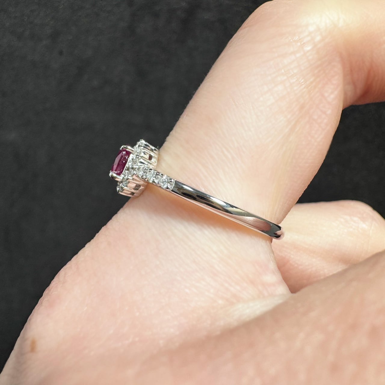 周囲とアームには計0.13ctのダイヤモンドをセッティング。ルビーを囲むヘイローデザインにより、センターストーンがより大きく、より美しく見える設計です。