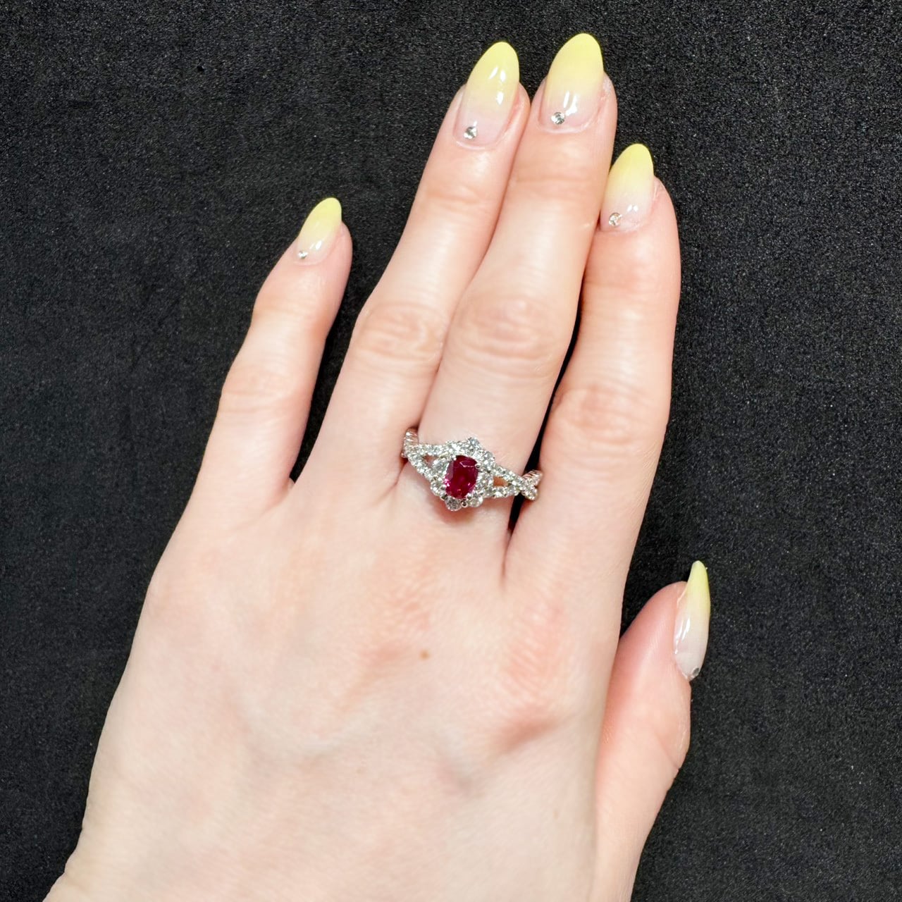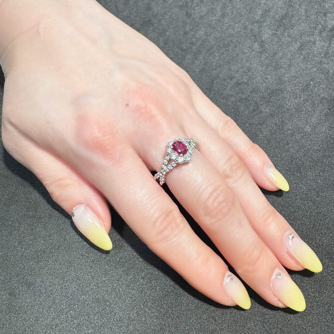 鮮やかな深紅が視線を奪う、0.76ctのルビーを主役に据えた存在感のあるデザインリング。周囲を取り巻くダイヤモンドとクロスしたアームの立体感が重なり、指元に華やかさと奥行きを演出します。1本でしっかり主役になる完成度の高い一本です。